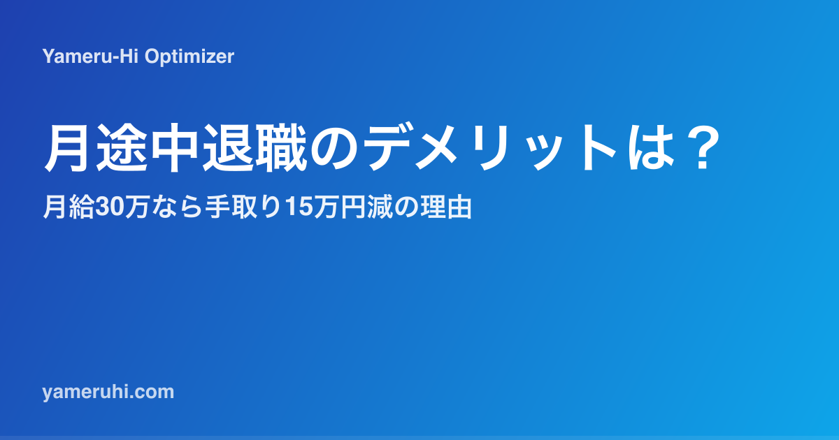 月の中旬に退職すると、給与は日割りで大幅に減るうえ、社会保険から外れた月は国民健康保険・国民年金の負担が発生する場合があり、月給30万円なら手取りで約15万円減になることもあります。ただし、転職先の入社日が固定されているなど、月途中退職が避けられない・むしろ有利になるケースもあります。